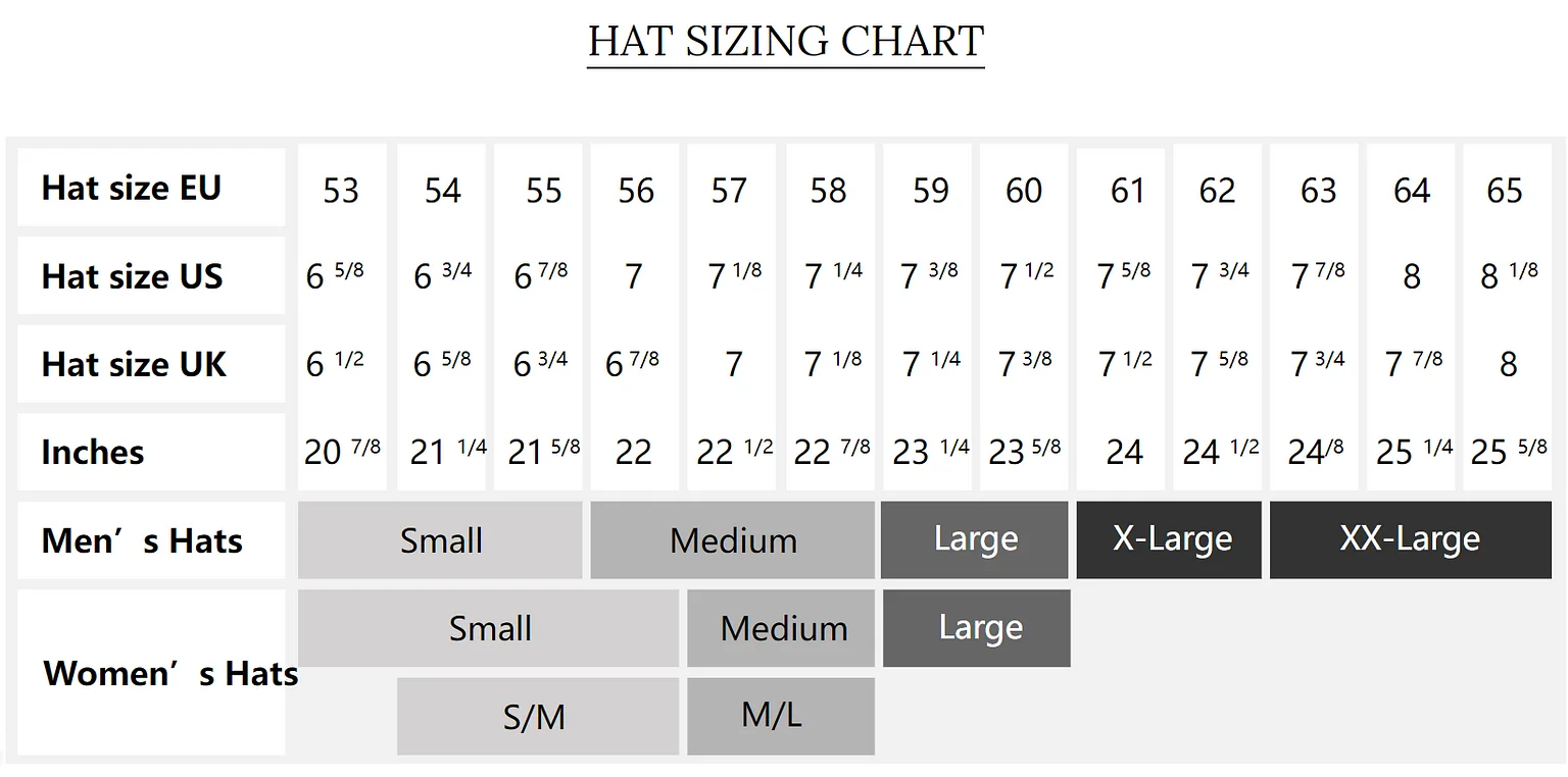 Use a tape measure (or a length of string that you will have to hold up to a tape measure) to determine the length. Place the string or tape around your head about 1/8″ above your ear, across the mid-forehead, completely circling your head. Hold the tape firmly, but not too tightly. Basically you need to measure your head exactly where the hat will sit. If your measurement falls between sizes, choose the next largest size.