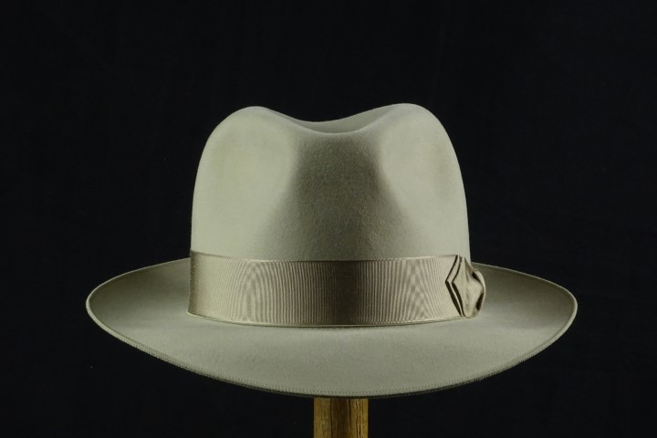 A classy fedora, done in Silverbelly beaver felt. 4" crown with center crease and medium pinches. 1 1/2" beanbelly ribbon with double chevron bow and matching wind cord. The classic snap brim is 2 3/8" with a tidy wipe stitched edge.